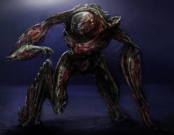 He has black skin and four glowing red eyes as opposed.